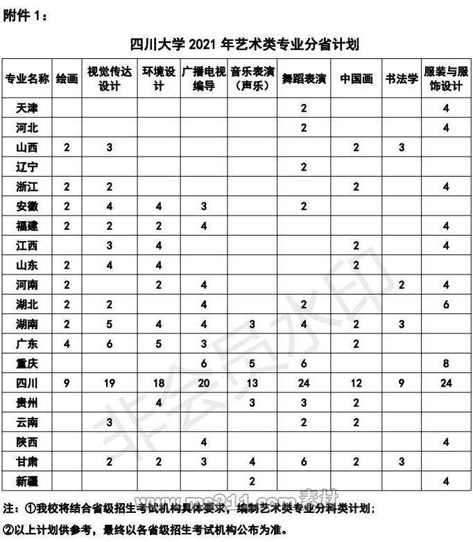 1.四川大學(xué)2021年藝術(shù)類本科招生專業(yè)為繪畫、中國畫、視覺傳達(dá)設(shè)計(jì)、環(huán)境設(shè)計(jì)、書法學(xué)、服裝與服飾設(shè)計(jì)、廣播電視編導(dǎo)、舞蹈表演和音樂表演(聲樂)九個(gè)專業(yè)。