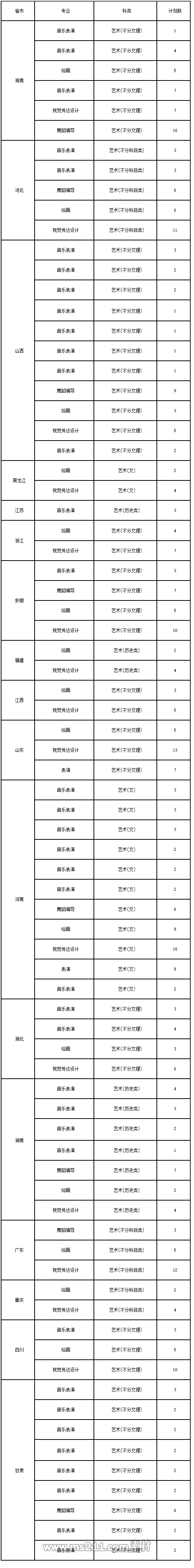 藝術(shù)類專業(yè)成績采用生源省相應(yīng)的藝術(shù)聯(lián)考(統(tǒng)考)成績。在高考改革省份,藝術(shù)類專業(yè)選考科目不限;藝術(shù)分文理的省份,僅招收藝術(shù)(文)考生。學(xué)校執(zhí)行生源所在省該類專業(yè)的投檔規(guī)則,考生文化統(tǒng)考成績和專業(yè)成績均需達到省定相應(yīng)批次錄取控制分數(shù)線。
