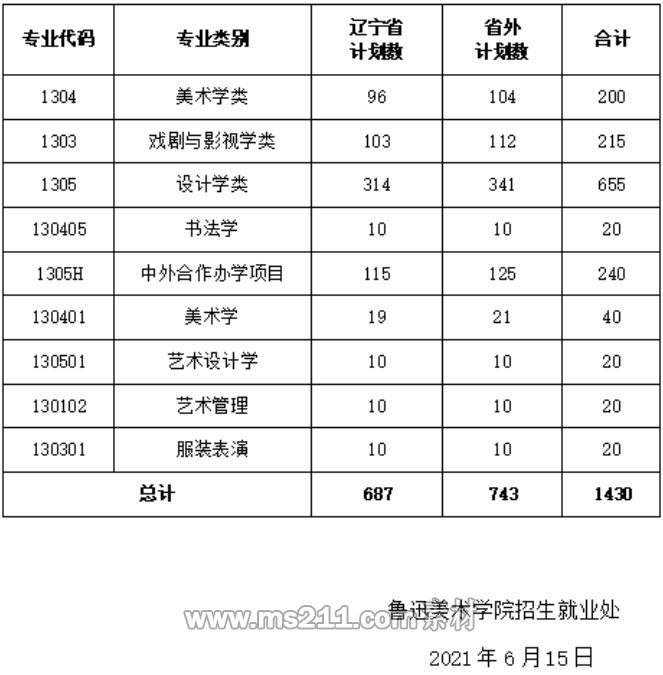 經(jīng)遼寧省教育廳審核批準(zhǔn),現(xiàn)公布魯迅美術(shù)學(xué)院2021年本科招生各專業(yè)類別計(jì)劃數(shù)。 我院各專業(yè)類別除遼寧省外,外省不編制分省計(jì)劃,遼寧省考生統(tǒng)一排名,外省考生統(tǒng)一排名;各專業(yè)類別文理(物理學(xué)和歷史學(xué)科類)兼招,文理科(物理學(xué)和歷史學(xué)科類)考生統(tǒng)一排名。