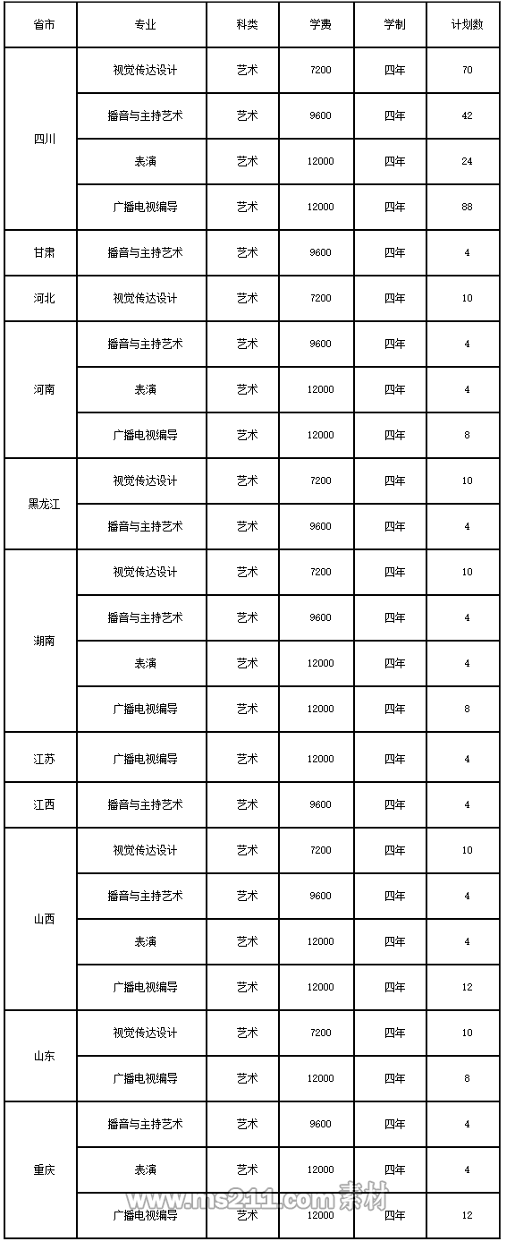 我校使用生源所在?。ㄗ灾螀^(qū)、直轄市)統(tǒng)一組織的藝術(shù)類專業(yè)考試成績,對文化考試和專業(yè)考試成績均上線的考生采用“專業(yè)志愿優(yōu)先”的方式,按各省級招生考試機(jī)構(gòu)規(guī)定的投檔規(guī)則錄??;各省級招生考試機(jī)構(gòu)沒有明確投檔規(guī)則的,廣播電視編導(dǎo)專業(yè)按文化成績從高分到低分擇優(yōu)錄取,若文化成績相同,依次按專業(yè)成績、外語、語文單科成績從高到低排序;播音與主持藝術(shù)、表演、視覺傳達(dá)設(shè)計專業(yè)按專業(yè)成績從高分到低分擇優(yōu)錄取,若專業(yè)成績相同,依次按文化成績、外語、語文單科成績從高到低排序。其中四川省美術(shù)類考生文化成績要求達(dá)省控線上40分(含40分),四川省播音與主持藝術(shù)、表演專業(yè)考生文化成績要求達(dá)省控線上20分(含20分)。報考播音與主持藝術(shù)、表演專業(yè)要求身高男生不低于1.70米,女生不低于1.60米。