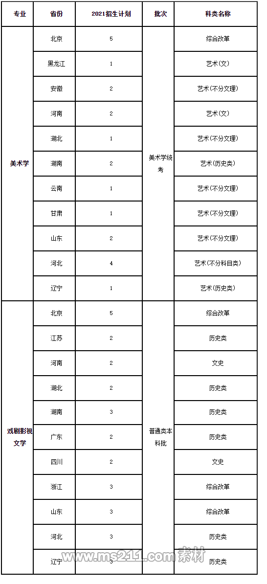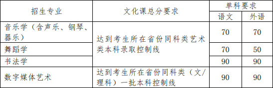 3.美術(shù)學(xué)(含美術(shù)學(xué)、藝術(shù)設(shè)計學(xué)專業(yè))專業(yè)須參加各省份美術(shù)學(xué)和設(shè)計學(xué)類省級統(tǒng)考,統(tǒng)考合格考生在高考文化課成績(不含政策性加分)不低于考生所在省份同科類(文/理科)本科第一批次錄取控制分數(shù)線(對于合并本科批次及實施高考改革省份本科第一批次錄取控制分數(shù)線參照省級招生考試機構(gòu)劃定的特殊類型招生控制分數(shù)線或省級招生考試機構(gòu)相關(guān)規(guī)定執(zhí)行)90%的條件下,按照進檔考生的美術(shù)學(xué)(含美術(shù)學(xué)、藝術(shù)設(shè)計學(xué)專業(yè))專業(yè)對應(yīng)省級統(tǒng)考成績擇優(yōu)錄取。入校后不得轉(zhuǎn)為非藝術(shù)類專業(yè)。 4.戲劇影視文學(xué)專業(yè)無需藝術(shù)類考試,使用高考成績錄取。報考考生在高考文化課成績(不含政策性加分)不低于考生所在省份同科類(文/理科)本科第一批次錄取控制分數(shù)線(對于合并本科批次及實施高考改革省份本科第一批次錄取控制分數(shù)線參照省級招生考試機構(gòu)劃定的特殊類型招生控制分數(shù)線或省級招生考試機構(gòu)相關(guān)規(guī)定執(zhí)行)的條件下,按照進檔考生的高考文化課成績及專業(yè)志愿擇優(yōu)錄取。入校后不得轉(zhuǎn)為非藝術(shù)類專業(yè)。