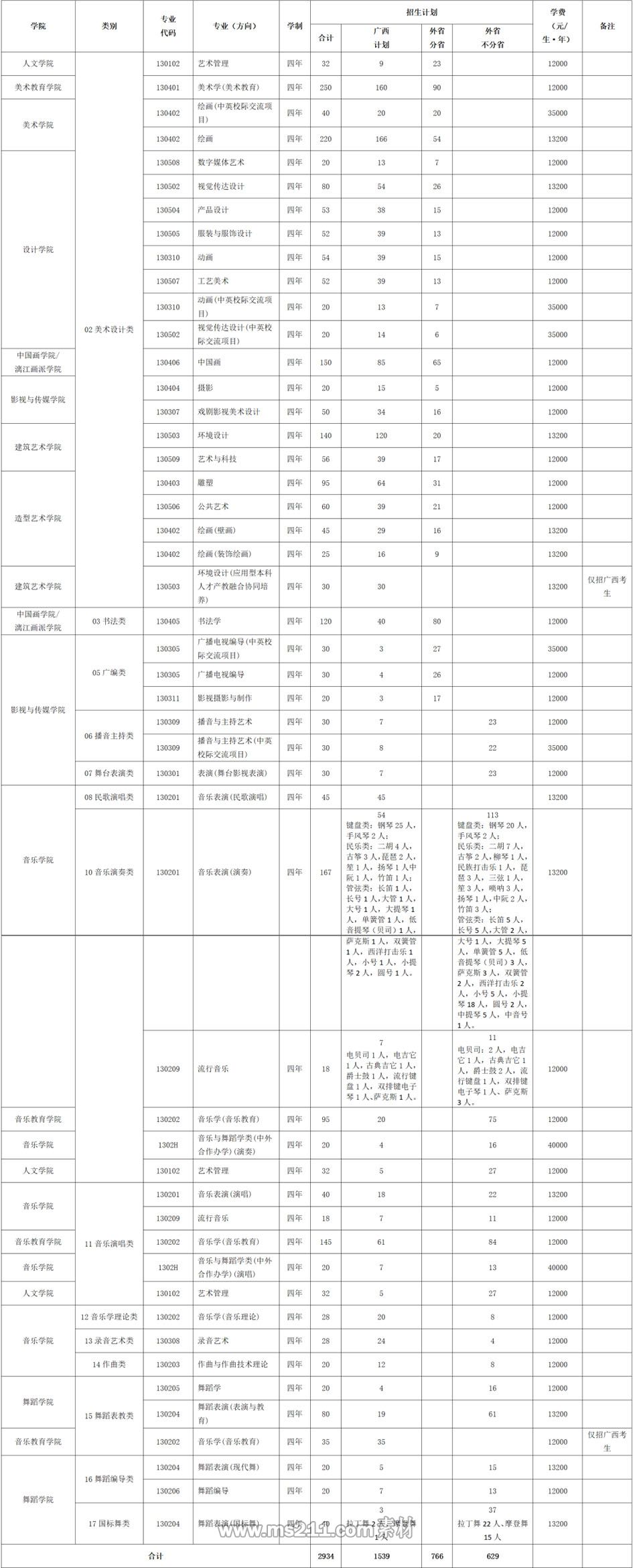 按照教育部規(guī)定,我校藝術(shù)類本科專業(yè)可不編制分省分專業(yè)計(jì)劃,2021年受疫情影響,我校招生計(jì)劃分為廣西計(jì)劃和外省計(jì)劃,其中外省計(jì)劃含外省分省和外省不分省。 ?。ㄒ唬V西計(jì)劃: