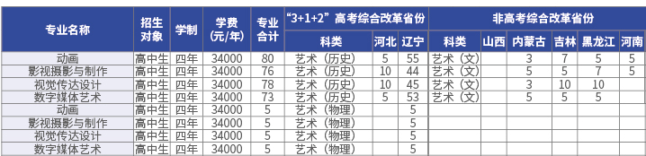 動畫、視覺傳達設(shè)計、影視攝影與制作、數(shù)字媒體藝術(shù)專業(yè),對非高考綜合改革省份,僅招收藝術(shù)文史類考生;對實行“3+1+2”高考綜合改革的省份,物理歷史學科類兼招;對實行“3+3”高考綜合改革的省份,無文理分科要求。