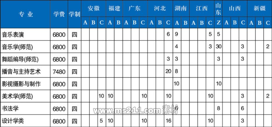 音樂(lè)類、舞蹈編導(dǎo)專業(yè)錄?。何幕煽?jī)達(dá)到省控線且專業(yè)成績(jī)分別達(dá)到我校相應(yīng)專業(yè)??己细窬€(使用省統(tǒng)考或聯(lián)考成績(jī)的達(dá)到省統(tǒng)考或聯(lián)考控制分?jǐn)?shù)線)的進(jìn)檔考生,按專業(yè)成績(jī)從高到低順序錄取。