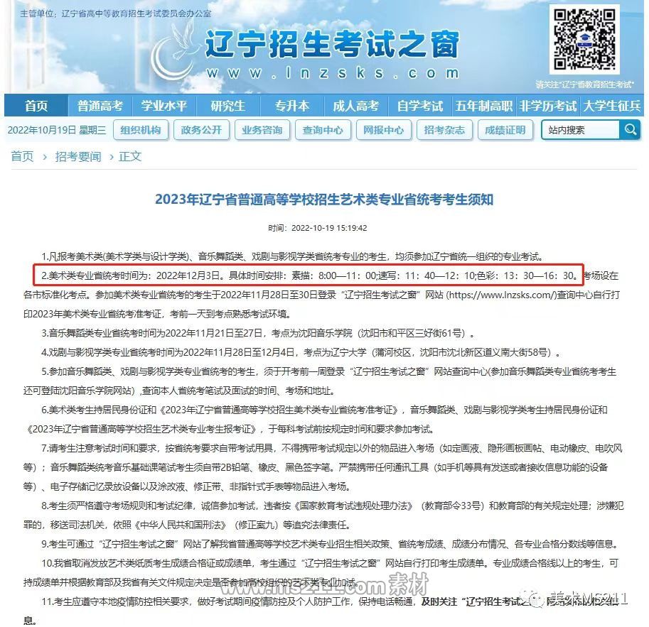 2.凡報考美術類專業(yè)省統(tǒng)考時間為:2022年12月3日。具體時間安排:素描:8:00—11:00;速寫:11:40—12:10;色彩:13:30—16:30??紙鲈O在各市標準化考點。參加美術類專業(yè)省統(tǒng)考的考生于2022年11月28日至30日登錄“遼寧招生考試之窗”網(wǎng)站 (https://www.lnzsks.com/)查詢中心自行打印2023年美術類專業(yè)省統(tǒng)考準考證,考前一天到考點熟悉考試環(huán)境。