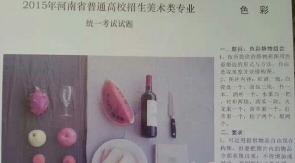 色彩考題:自由構圖,紅酒一瓶,白磁盤一個,面包三塊,書一本,酒杯一個,水果刀一把,襯布兩塊,西瓜一塊,火龍果一個,黃蘋果一個,紅蘋果一個,桔子兩個,梨兩個。