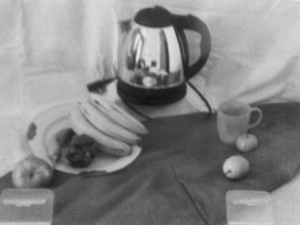 素描:(黑白照片)是快壺一個(gè)盤子里有香蕉和一個(gè)大辣椒和尖椒 水杯子 梨 橘子