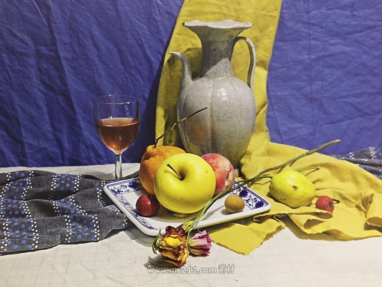 色彩題目: 一個淺色罐子 一個白色盤子 兩只干花 兩個蘋果 一個桔子 一個高腳杯(半杯帶顏色的水)兩個山楂 一個桂圓 兩塊襯布