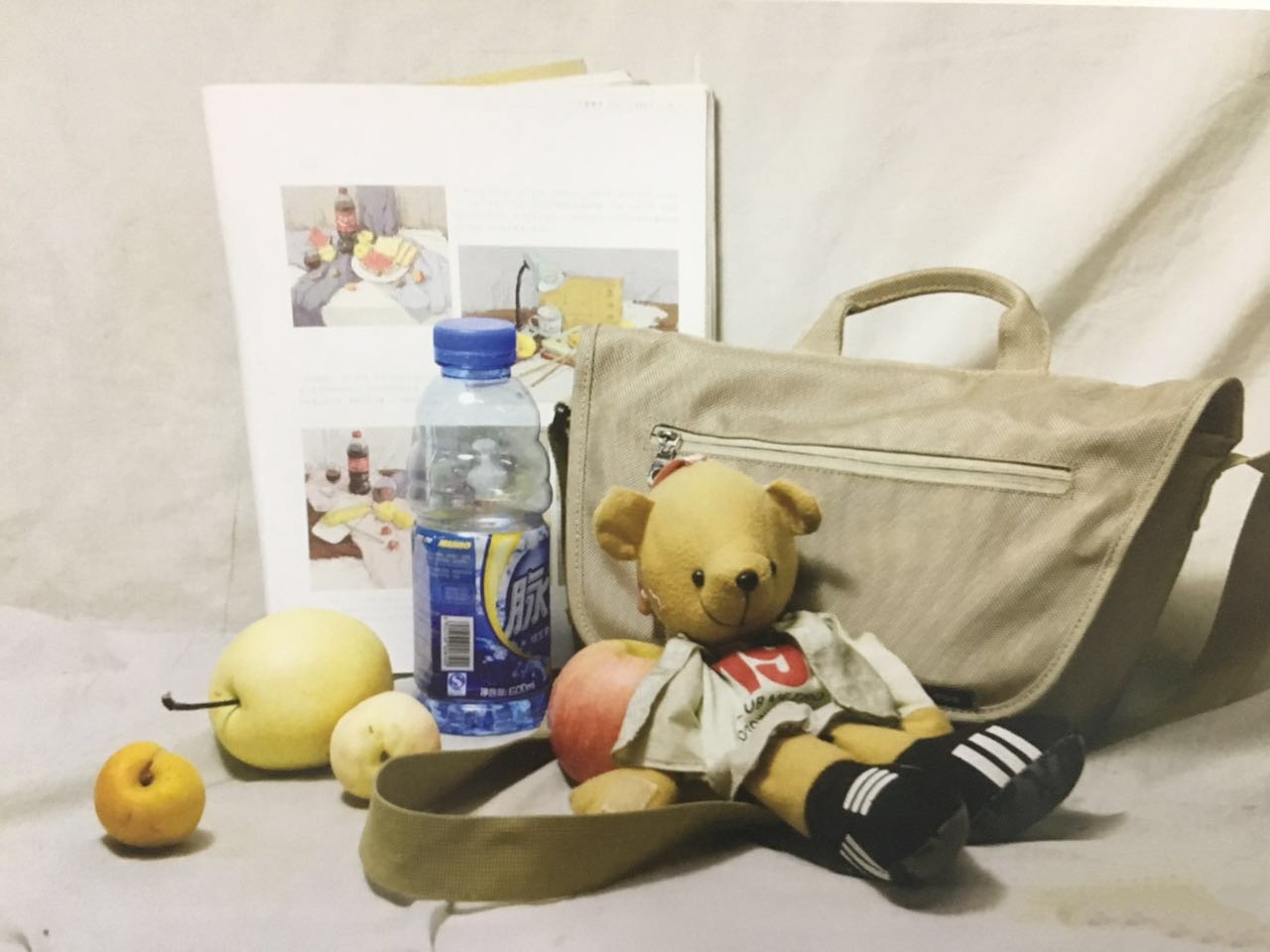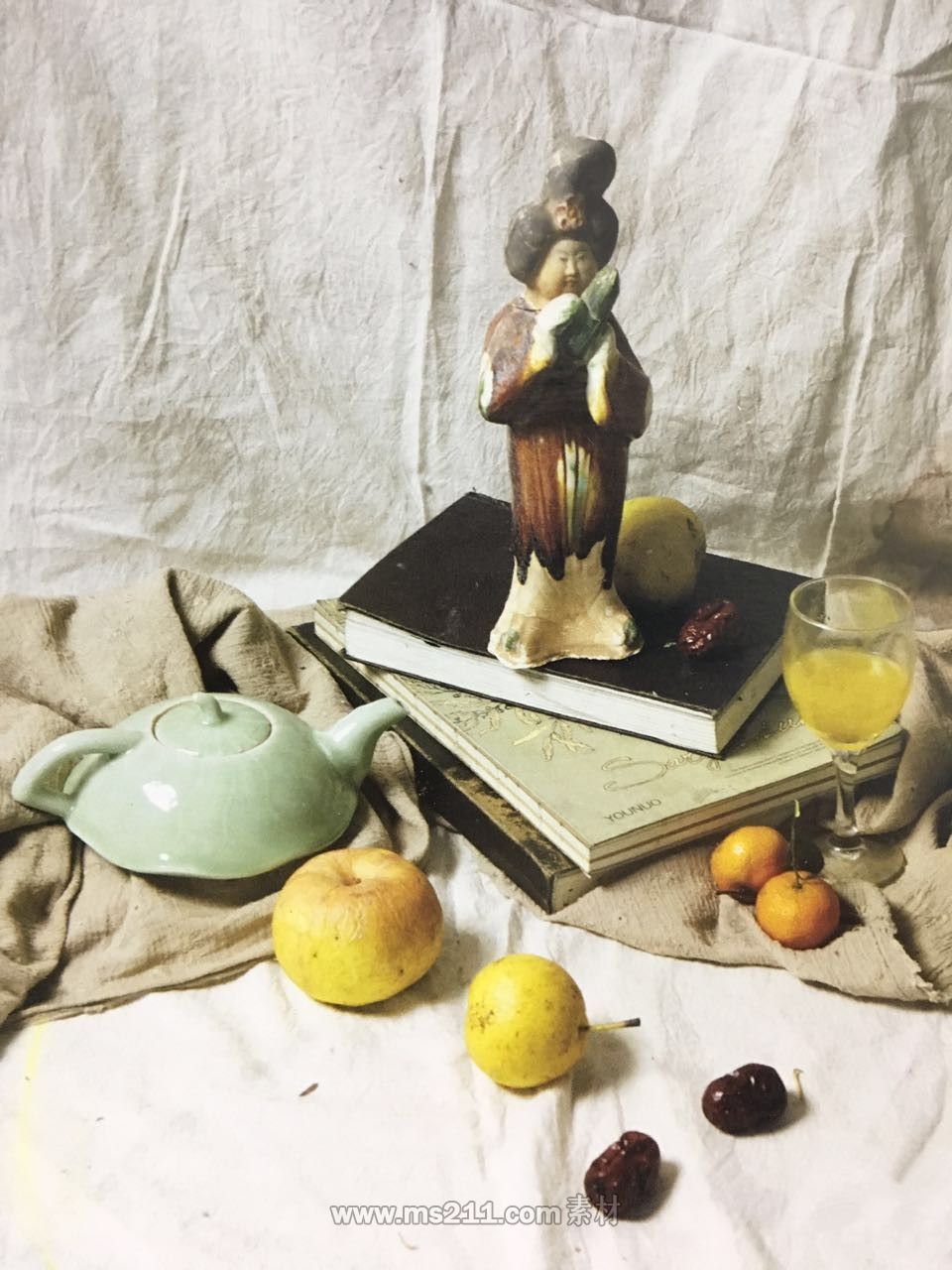 色彩題目: 一個唐三彩 三本書 一個茶壺 一個玻璃杯 三個蘋果 兩個句子 兩個紅棗 一塊襯布