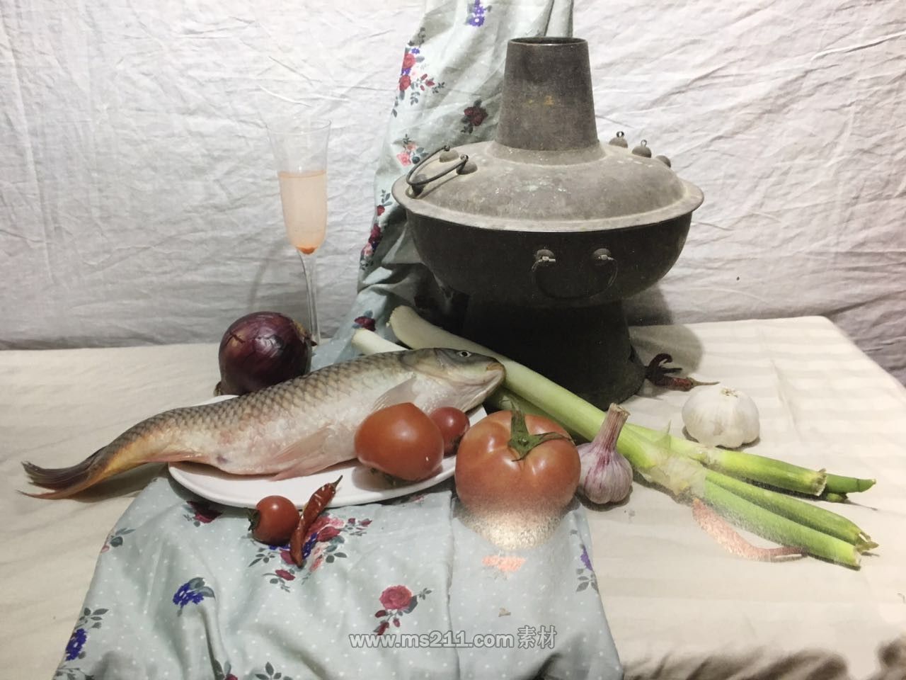 色彩題目: 一個火鍋 一個盤子 一個高腳杯 一條魚 兩根蔥 兩個蒜瓣 四個西紅柿 一個洋蔥 若干小辣椒 一塊碎花襯布