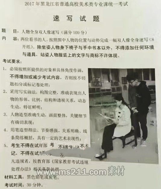 內(nèi)容:兩個看書的人。按照圖中人物的位置與動勢完成一幅雙人像全身速寫(8開紙)。除坐姿人物身下與手中書本以外,不得添加任何環(huán)境與道具,站姿人物服裝上文字與商標(biāo)不許體現(xiàn)。