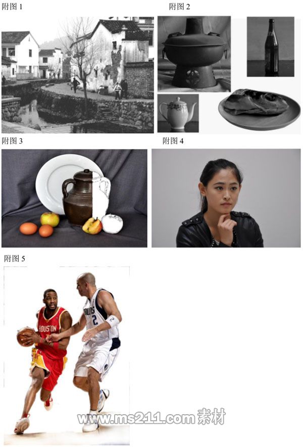 三、模擬寫生內(nèi)容:一個火鍋,一個茶壺,一個啤酒瓶,一個魚頭,一個瓷盤。(圖片小樣見 附圖 2)