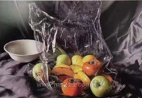 色彩考題:照片模擬寫生,一個透明塑料袋(袋中有三個青蘋果、兩個柿子、三個楊桃、兩個檸檬)、一個白碗、一塊深色襯布