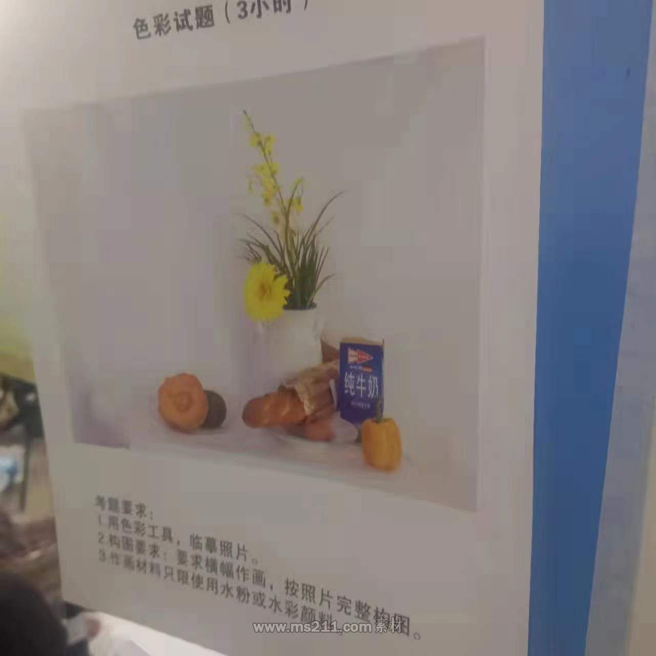 色彩考題:靜物組合,一個(gè)插著鮮花的白色花瓶,一盒裝牛奶,切開(kāi)的南瓜,1個(gè)黃彩椒等