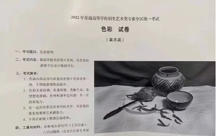 色彩工具與材料:水粉、水彩均可(考生自備),八開(kāi)水粉紙(由自治區(qū)招生考試院統(tǒng)一提供);無(wú)圖文記號(hào)的畫(huà)板或畫(huà)夾(考生自備)。