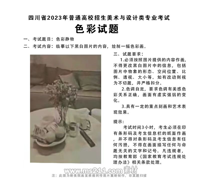 考試工具和材料:試卷用紙為八開水粉紙、水彩紙、素描紙(考點提供),繪畫工具為水彩、水粉、丙烯顏料(考生自備)。