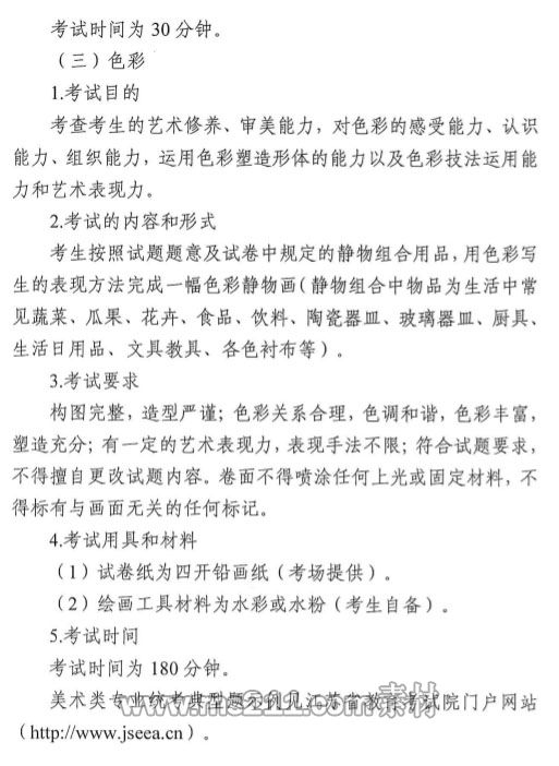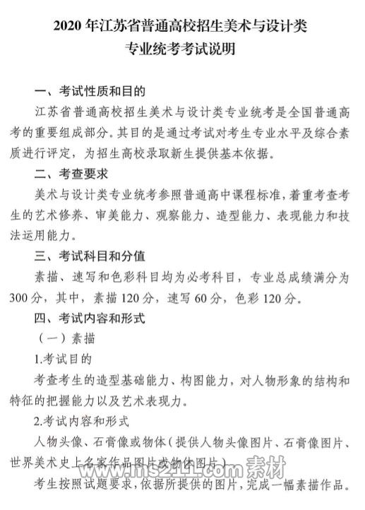 注:各科目考試具體要求見(jiàn)當(dāng)年江蘇省普通高校招生美術(shù)與設(shè)計(jì)類專業(yè)省統(tǒng)考考試說(shuō)明和試題卷面說(shuō)明。