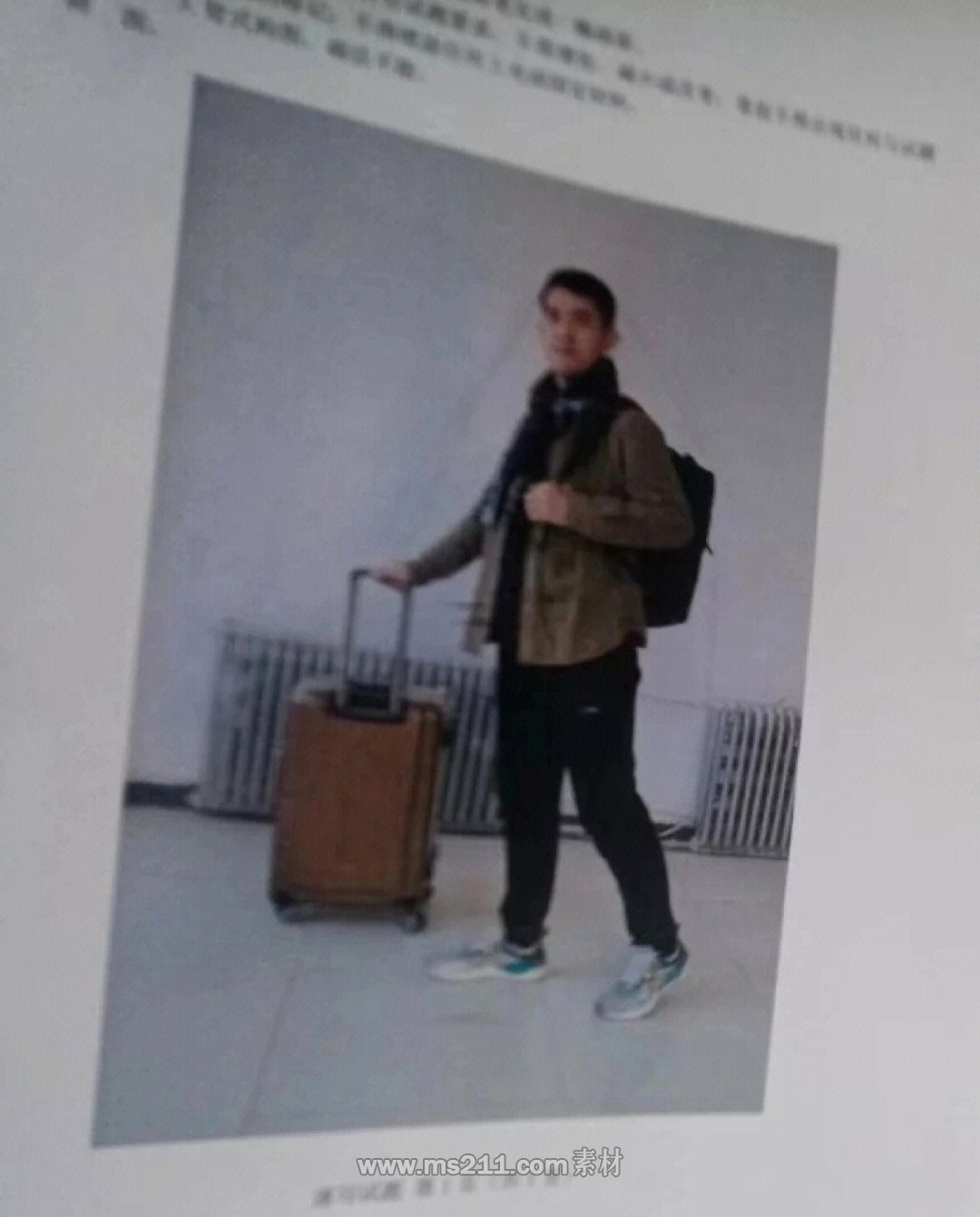 速寫考題:豎構(gòu)圖,人物速寫,照片模擬寫生,一個(gè)男青年,背個(gè)背包,右手拉一個(gè)行李箱