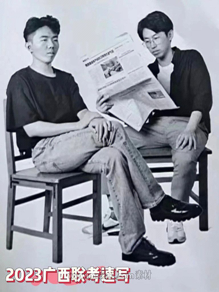 速寫考題:照片模擬寫生,兩個坐姿看報紙的男青年,如下圖