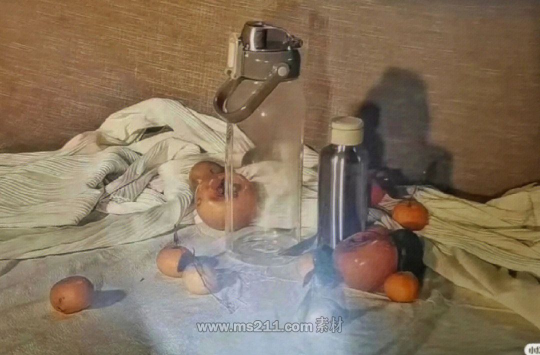 色彩考題:靜物組合照片模擬寫生,玻璃杯、水果、襯布等靜物,具體如下圖: