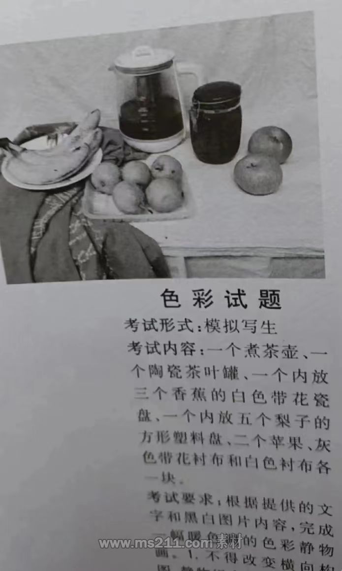 色彩考題:模擬寫生。一個(gè)白色瓷盤六個(gè)石榴(其中五個(gè)放置瓷盤中)、一個(gè)撥浪鼓、兩顆紫葡萄、深色和白色襯布各一塊。