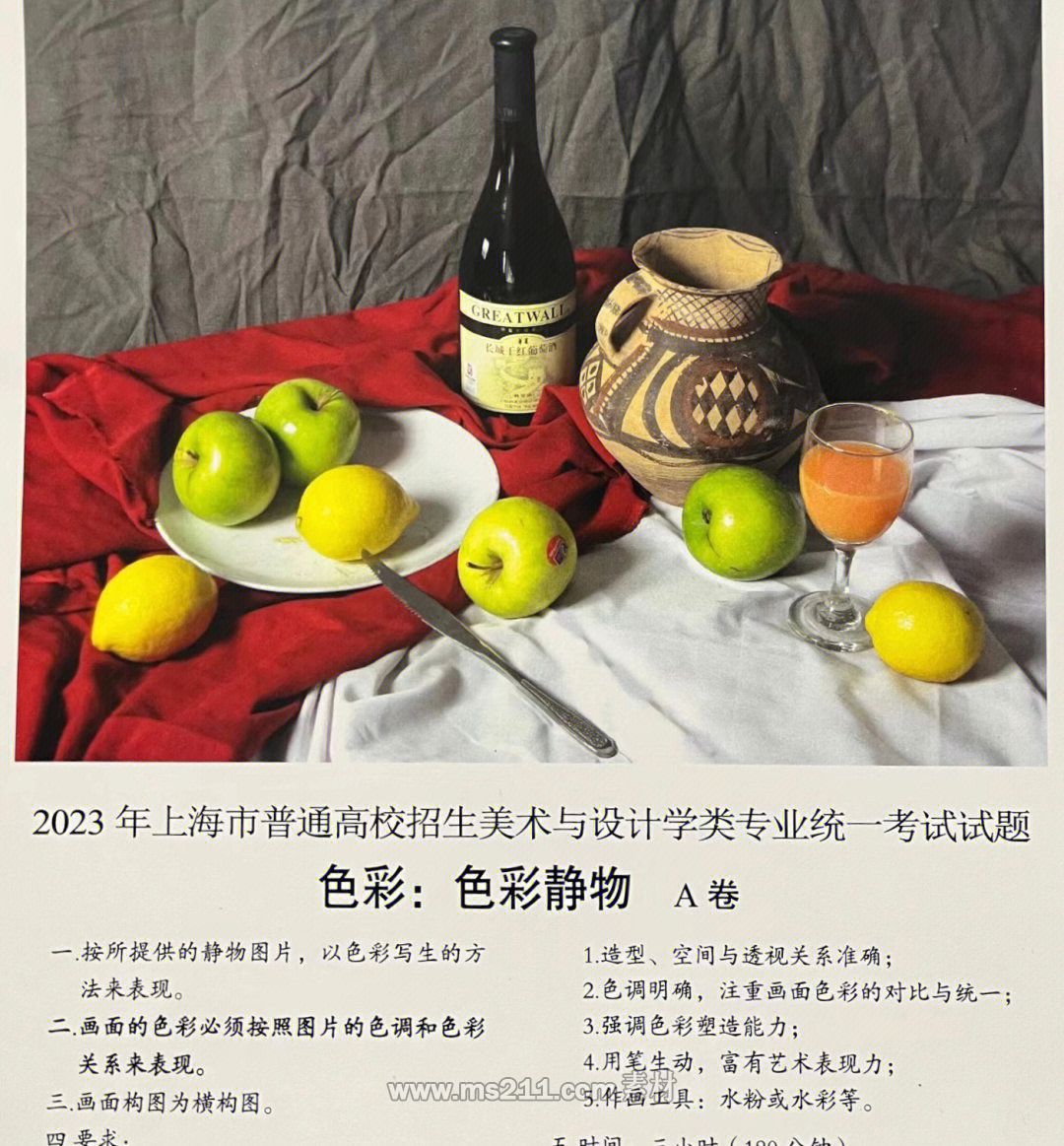 色彩考題:照片模擬寫生,紅酒瓶、陶罐、綠蘋果、黃檸檬、高腳杯(盛有果汁)、白瓷盤、不銹鋼刀,紅色、白色、灰色襯布各一塊。
