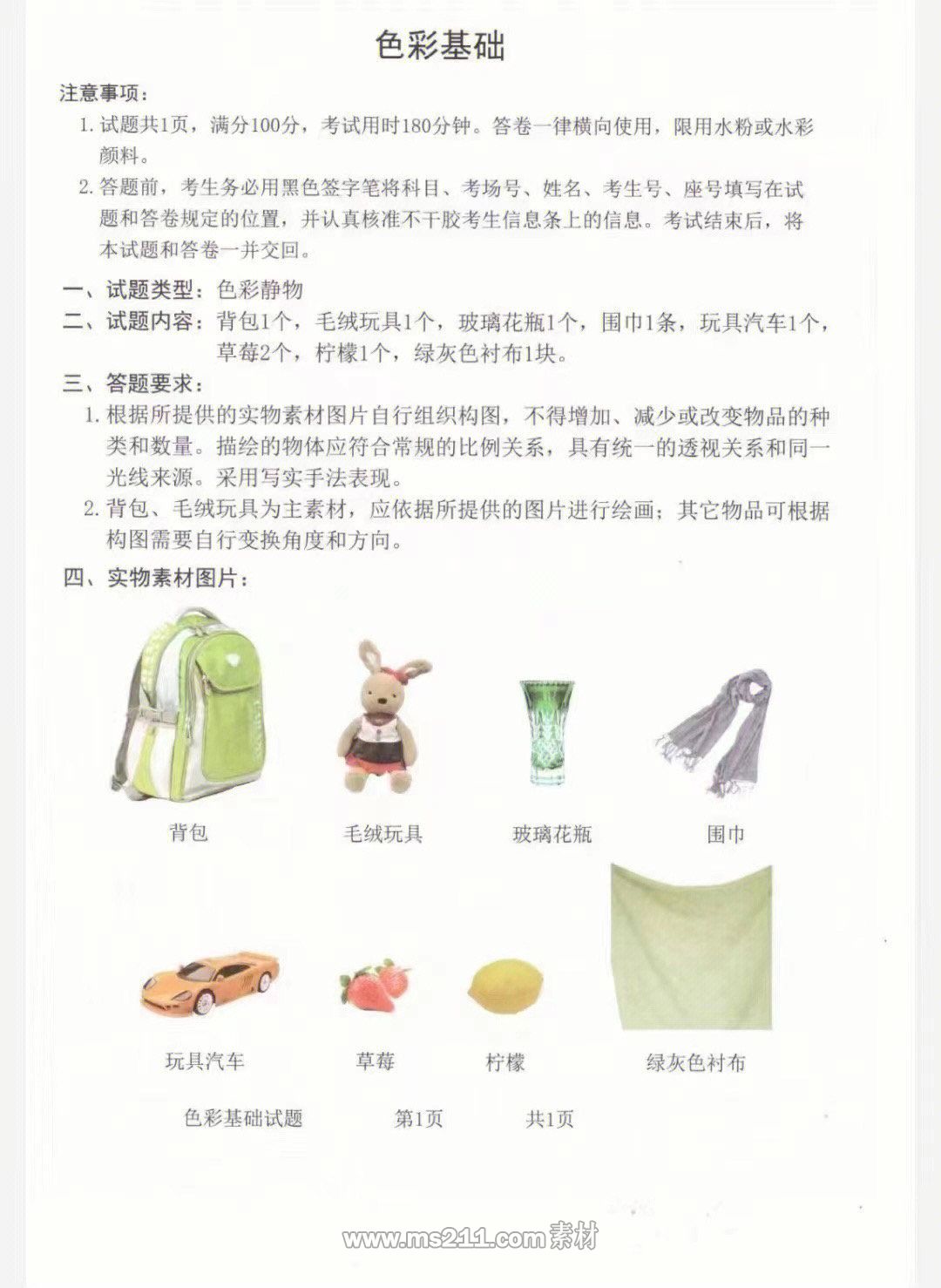 色彩考題:靜物組合,背包1個(gè),毛絨玩具1個(gè),玻璃花瓶1個(gè),圍巾1條,玩具汽車1個(gè),草莓2個(gè),檸檬1個(gè),綠灰色襯布1塊。