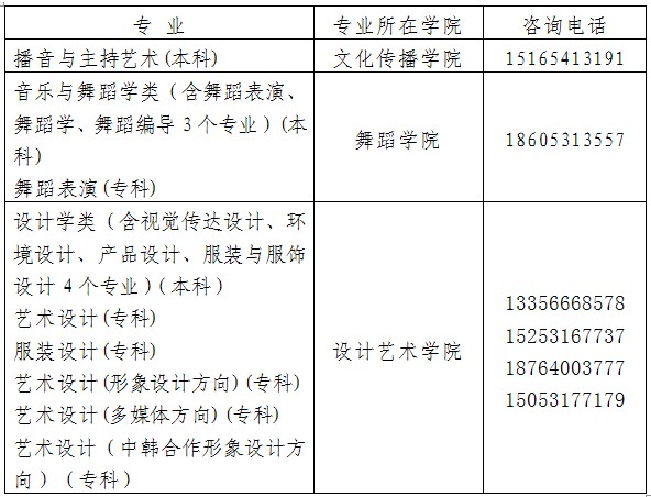 普通本科:播音與主持藝術(shù)、音樂與舞蹈學類(包含舞蹈編導、舞蹈學、舞蹈表演3個專業(yè))、設計學類(包含視覺傳達設計、環(huán)境設計、產(chǎn)品設計、服裝與服飾設計4個專業(yè));