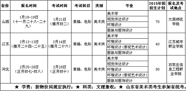 1.美術(shù)類全國招生計劃:410人。其中山東省招生計劃:210人;外省招生計劃:200人(只在河北省、江蘇省、山西省招生)。