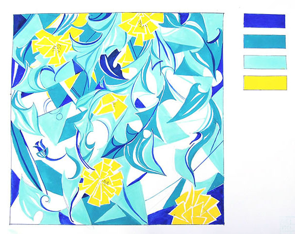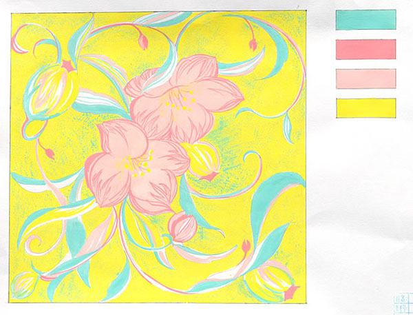 2、采用一定的創(chuàng)意方式,從花卉圖片中提取設(shè)計元素(花、葉、根莖、果實等皆可,可局部選用,也可全部運(yùn)用,也可以重復(fù)利用),作適度的夸張或變形等手法,完成裝飾效果。