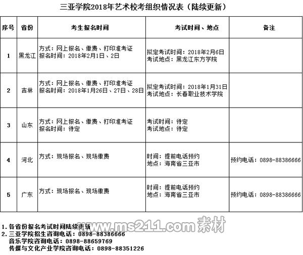 我校藝術(shù)專業(yè)單獨測試(??迹┏煽冏罱K結(jié)果于2018年5月公布,請考生及時關(guān)注三亞學院招生信息網(wǎng)http://zhaosheng.sanyau.edu.cn/。所有參加我校藝術(shù)類專業(yè)測試的考生可通過三亞學院錄取查詢系統(tǒng)查詢成績,并自行下載、打印專業(yè)合格證,學校不再統(tǒng)一郵寄。不合格考生不再另行通知。