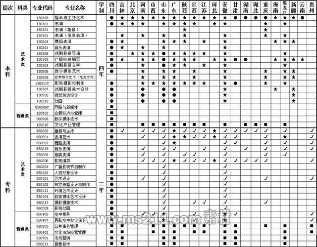 √代表該省設(shè)有相關(guān)藝術(shù)類(lèi)專(zhuān)科專(zhuān)業(yè)招生計(jì)劃。專(zhuān)業(yè)成績(jī)均認(rèn)定當(dāng)?shù)芈?lián)考或統(tǒng)考成績(jī),錄取原則按四川省內(nèi)的錄取原則執(zhí)行;如當(dāng)?shù)責(zé)o相關(guān)藝術(shù)類(lèi)專(zhuān)業(yè)的聯(lián)考或統(tǒng)考,則該專(zhuān)科層次的專(zhuān)業(yè)考試成績(jī)認(rèn)可方式以生源地省、市招生考試院公布為準(zhǔn)。