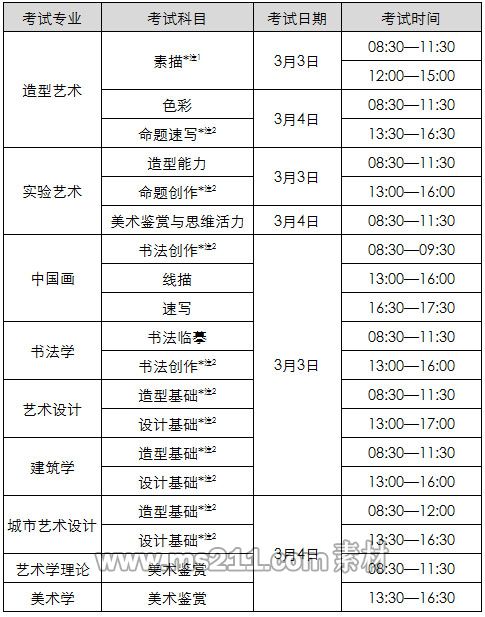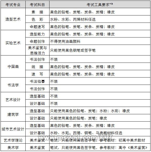 *注:專業(yè)考試可以使用定畫液。上述表格中各專業(yè)有限定工具材料的,一律按要求使用,若考生在考試中有違反情況,閱卷時按違規(guī)處理。