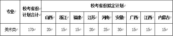 我校2018年美術類專業(yè)擬在湖南、山西、浙江、福建、江蘇、河南、安徽、廣西、江西、內蒙古等省份招生。??际》輸M定計劃見下表,湖南等承認省統(tǒng)考成績省份招生計劃另行公布,具體招生計劃詳見各?。▍^(qū)、市)2018年招生計劃來源表。