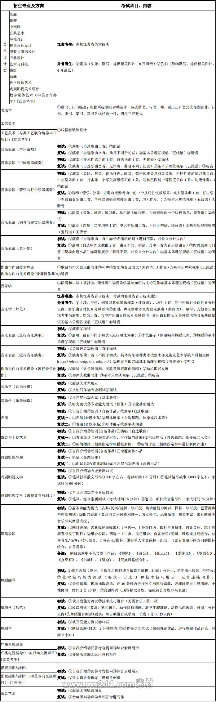 報(bào)考其他學(xué)院的音樂(lè)學(xué)(師范)、繪畫(huà)、中國(guó)畫(huà)、雕塑、公共藝術(shù)、環(huán)境設(shè)計(jì)、視覺(jué)傳達(dá)設(shè)計(jì)、服裝與服飾設(shè)計(jì)、產(chǎn)品設(shè)計(jì)、藝術(shù)與科技、戲劇影視美術(shù)設(shè)計(jì)、攝影、動(dòng)畫(huà)、數(shù)字媒體藝術(shù)(含中英合作辦學(xué))專業(yè)的江蘇省考生,只需參加江蘇省音樂(lè)或美術(shù)專業(yè)統(tǒng)考。