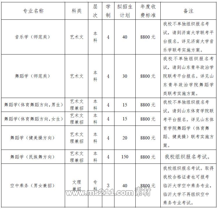 說明:1、空中乘務專業(yè)為春秋航空有限公司等公司定向培養(yǎng);2、實際招生計劃以山東省教育招生考試院最終公布數(shù)據(jù)為準;3、以上所列計劃均為濱州學院山東省內招生計劃。 二、報名 三、測試 四、舞蹈學(民族舞方向)、空中乘務專業(yè)招生有關要求 五、錄取 聯(lián)系方式 |
