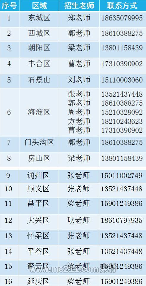 報考注意事項 報名方式 考試安排 北京市考生報考注意事項 各專業(yè)學(xué)費均為69800元/學(xué)年,各專業(yè)學(xué)費中均包含: 北京市各區(qū)招生宣傳老師聯(lián)系方式