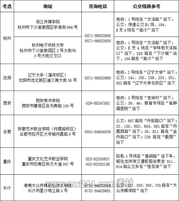 注:以上廣電藝術(shù)類本科專業(yè)及專業(yè)方向面向全國招生,設(shè)杭州、沈陽、西安、合肥、重慶和長沙6個初試考點,復(fù)試和三試只設(shè)杭州考點??忌砂锤魇】荚囋?招生辦)規(guī)定選擇考點參加我校組織的考試。