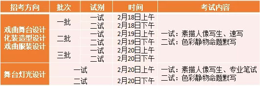 注:批次僅指考試時(shí)間的不同,考生可在報(bào)考系統(tǒng)內(nèi)自行選擇,舞臺(tái)美術(shù)系各招考方向考試均在當(dāng)日完成,各批次、各招考方向之間均不可兼報(bào),一經(jīng)發(fā)現(xiàn),以其最低分作為最終考試成績。