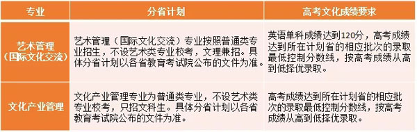 藝術(shù)管理(國際文化交流)專業(yè):英語單科成績達(dá)到120分,高考成績達(dá)到所在計(jì)劃省的相應(yīng)批次的錄取最低控制分?jǐn)?shù)線,按高考成績從高到低擇優(yōu)錄取。高考成績相同的情況下,則依次按語文、外語、數(shù)學(xué)成績的先后順序進(jìn)行單科成績比較,從高分到低分排序擇優(yōu)錄取。