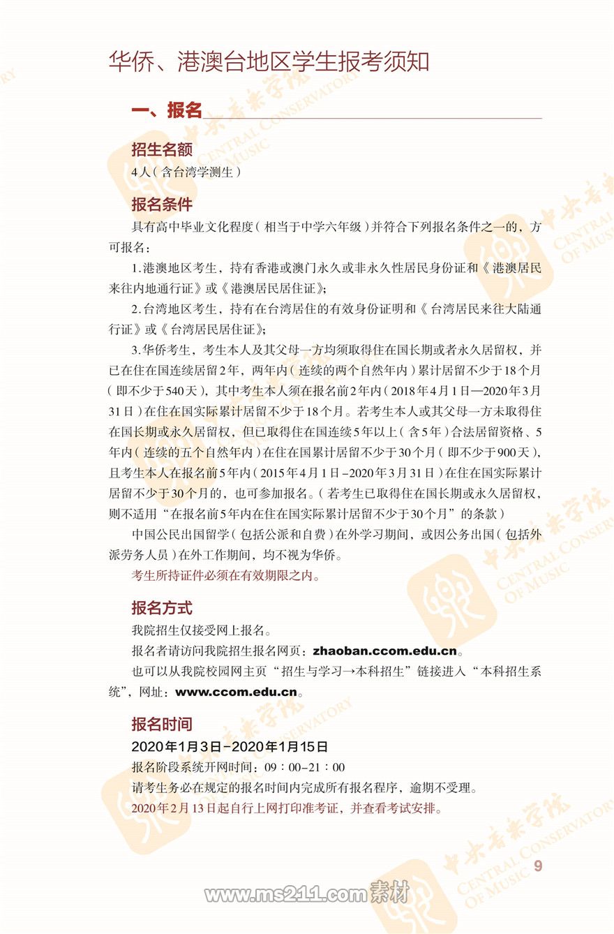 中央音樂學院2020年招收澳門保送生簡章