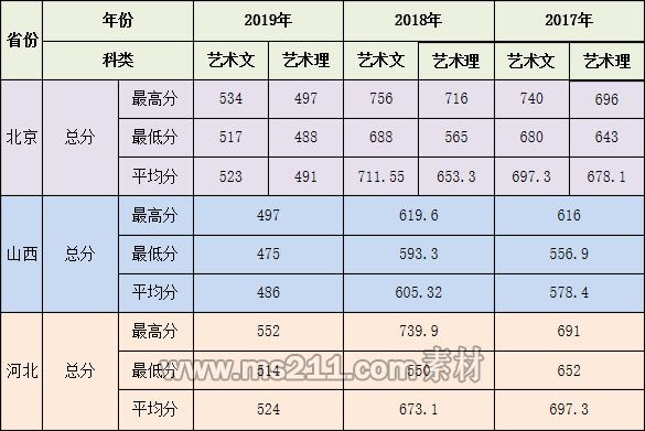 注:2019年總分為美術(shù)統(tǒng)考成績(jī)/300*750*50%+高考文化課成績(jī)(含政策性加分)*50%;2017-2018年總分為高考文化課成績(jī)加美術(shù)統(tǒng)考成績(jī)(含附加分)。