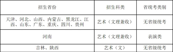 答:2020年我校藝術(shù)與科技專業(yè)在天津、河北等14個(gè)省份招生,各省統(tǒng)考類別要求根據(jù)各省情況各有不同,具體情況見下表: