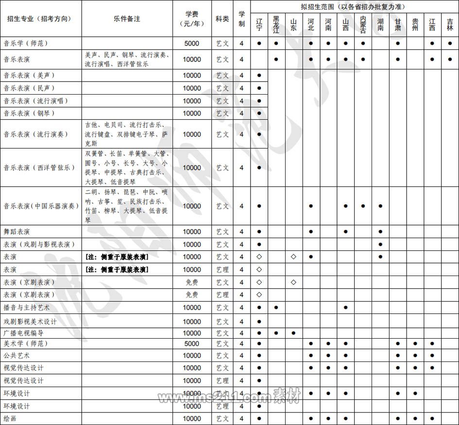 3、我校藝術類各專業(yè)與各省統(tǒng)考專業(yè)對應關系,詳見教育部“陽光高考信息平臺”。4、我校藝術類專業(yè)在不分文理的省份文理兼招;在分文理科的省份只招收“藝術文”;服裝表演、京劇表演、視覺傳達設計、環(huán)境設計在遼寧文理兼招。