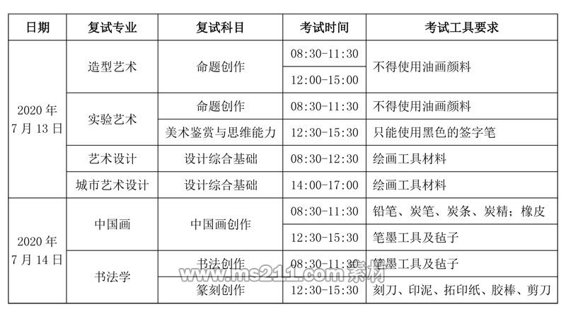 根據(jù)疫情防控要求,中央美術(shù)學(xué)院2020年本科招生專業(yè)復(fù)試工作設(shè)置北京、河北燕郊、沈陽(yáng)、青島、鄭州、武漢、長(zhǎng)沙、深圳、蘭州九個(gè)考點(diǎn)。請(qǐng)初審合格考生于2020年6月13日—15日(09:00--22:00)通過中央美術(shù)學(xué)院招生處微信公眾號(hào)登錄報(bào)名系統(tǒng)查看考點(diǎn)并進(jìn)行復(fù)試確認(rèn),考場(chǎng)具體安排另行通知。