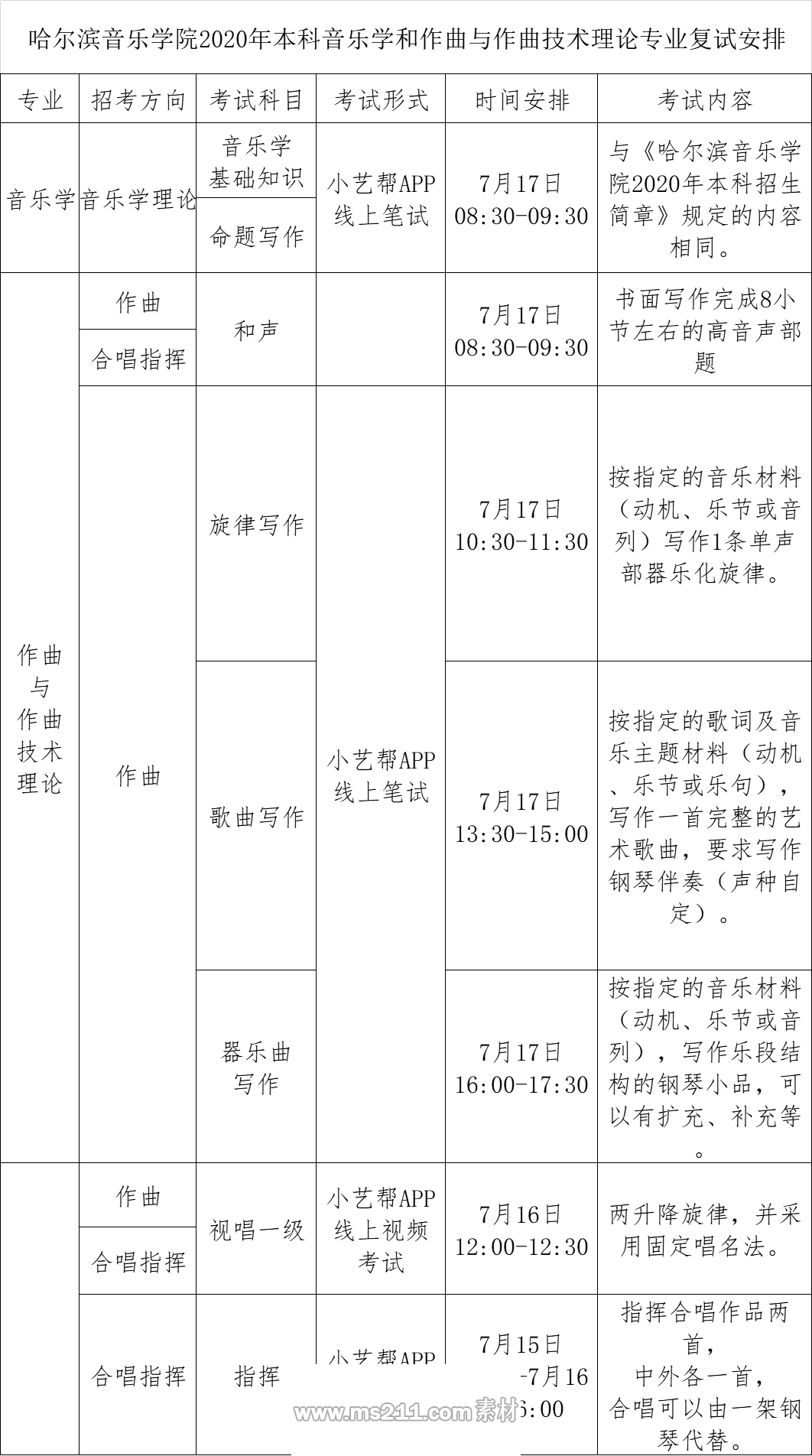 根據(jù)教育部《關(guān)于做好2020年普通高校特殊類型招生工作的通知》(教學司〔2019〕10號)文件和教育部關(guān)于2020年高校藝術(shù)類專業(yè)考試招生工作視頻會議精神和指導意見,結(jié)合《哈爾濱音樂學院關(guān)于2020年本科專業(yè)校考復試安排的通知》要求,現(xiàn)就音樂學、作曲與作曲技術(shù)理論2個本科專業(yè)??紡驮囉嘘P(guān)事項通知如下: