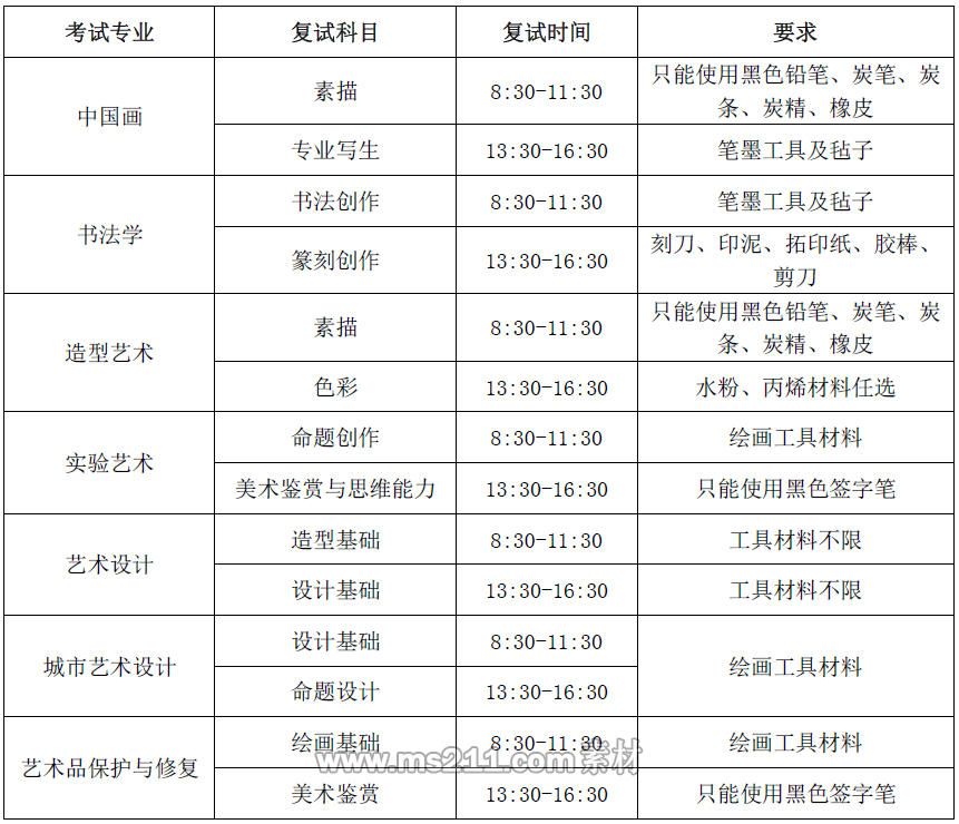 (二)現(xiàn)場(chǎng)復(fù)試日期為2021年3月20日,各專業(yè)復(fù)試科目、復(fù)試時(shí)間及要求如下: