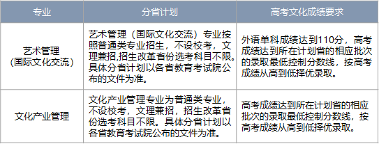 藝術(shù)管理(國(guó)際文化交流)專業(yè):外語(yǔ)單科成績(jī)達(dá)到110分,高考成績(jī)達(dá)到所在計(jì)劃省的相應(yīng)批次的錄取最低控制分?jǐn)?shù)線,按高考成績(jī)從高到低擇優(yōu)錄取。高考成績(jī)相同的情況下,則依次按語(yǔ)文、外語(yǔ)、數(shù)學(xué)成績(jī)的先后順序進(jìn)行單科成績(jī)比較,從高分到低分排序擇優(yōu)錄取。