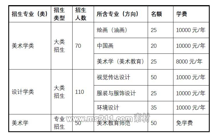 注:1.美術(shù)類校考專業(yè)將按美術(shù)學(xué)類、設(shè)計學(xué)類兩個大類招生,考生不得兼報。入校后根據(jù)??汲煽兣c志愿相結(jié)合的原則按照相應(yīng)的計劃數(shù)進入到相應(yīng)專業(yè)學(xué)習(xí)。