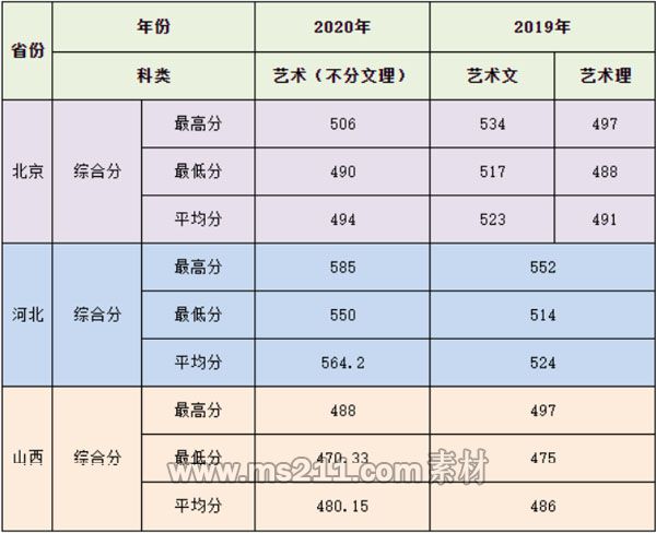 注:北京、山西2019-2020年綜合分為美術統(tǒng)考成績/300*750*50%+高考文化課成績(含政策性加分)*50%;河北2020年綜合分為美術統(tǒng)考成績/300*750*70%+高考文化課成績(含政策性加分)*30%,2019年綜合分為美術統(tǒng)考成績/300*750*50%+高考文化課成績(含政策性加分)*50%。